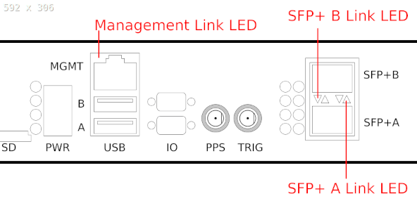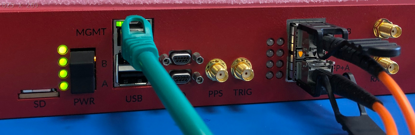 Lastly, we will need to attach the SFP+ A and SFP+ B ports from the host computer to the unit. Again, if your unit is properly connected on both ends, there should be an orange light glowing on the SFP+ ports on the front of the Crimson TNG unit.
