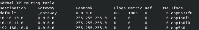 Using the example in 2.1., what we are looking for on the table is that there exists a default destination and gateway, and that the IP Destination is appropriate for the management and data IP addresses, that the Genmask is 255.255.255.0 and that the Iface matches the network adapter specificied. You will need to ensure this for all the MGMT and SFP+ ports/cables coming from the unit.