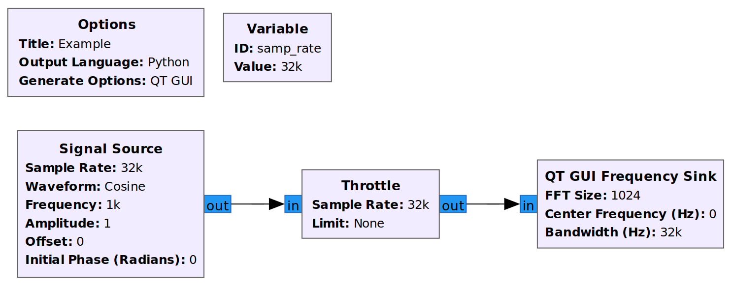 You will also need to verify that the GNU Radio companion software is in fact correctly installed. A simple way to ensure this is to open up a new GNU Radio project, place a Signal Source block and route this through a Throttle to a QT GUI Frequency Sink block. When this is run a frequency graph should appear; ensure there is no error messages. The GNURadio Wiki is an excellent resource for fixing errors and finding tutorials. This example is shown below: