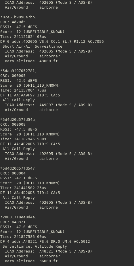 Run the GNU Radio script discussed in section 4 of this tutorial. You will now have a terminal displaying a continuous stream of all ADS-B signals in your range, similar to the Figure 4 below: