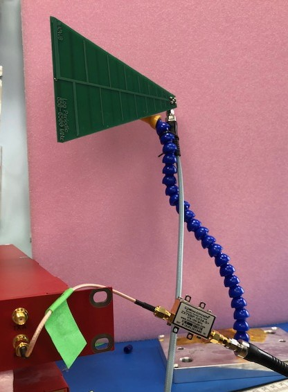 To setup the device, we used the log periodic antenna oriented for vertically polarized EM waves and connected to an SMA cable, which is connected to the input of our BP filter and then outputted to a shorter SMA cable which is then connected to Crimson TNG Rx channel A. See Figure 1 below for our setup: