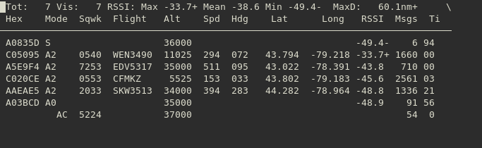 $ ./view1090 --lat 43.6589 --lon -79.4529 --modeacThis will provide more flight tracking data in a table.