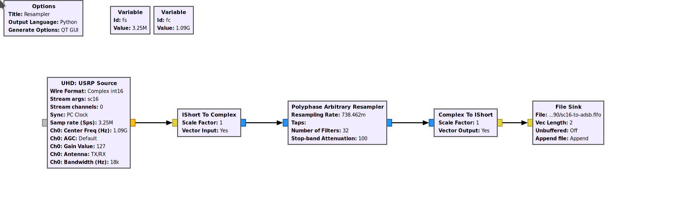 We also needed to create a flow graph in GNU Radio to capture and stream the data to our FIFO device. The GNU Radio program resamples the data to the sample rate required and streams it to the FIFO device which acts as our file sink before being passed to the dump1090 program. This GRC script provides data at 2.4MSPS as complex shorts and appends it to the FIFO file; the script captured at 3.25MSPS, and used a polyphase resampler with an appropriate resampling factor (==2.4/3.25) to resample the data before it streams to the FIFO pipe. The GNU Radio script is found here. It should look like Figure 2 below: