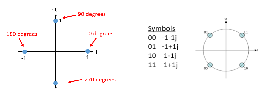 Quadrature Phase Shift Keying (QPSK) is a modulation scheme which transmits two bits per symbol which is possible due to the carrier frequency wave varying in four possible phase shifts. Figure 1 below shows how this is represented on a constellation diagram, with each bit being 90° out of phase, as well as how this is implemented using IQ pair modulation. QPSK is an advantageous in bandwidth efficiency since it can transfer more information at any one time. For example, compared to BPSK, QPSK is able to transmit twice the data rate while still having the same bit error rate (BER).